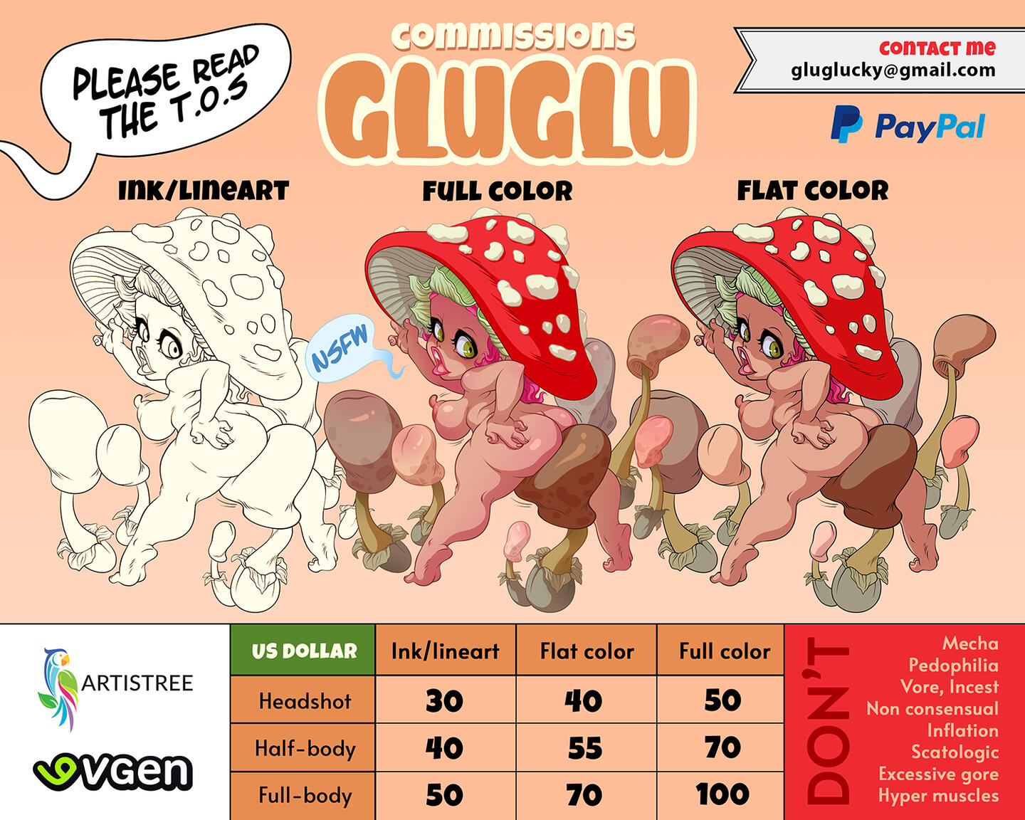 IMPORTANT• When commissioning, please send me as many references as you can for pose, outfit and character to make the process more fluid.• For NSFW pieces you MUST be 18 or older to request work from me.• Please let me know what is the best way to contact you. I personally prefer X DMs and email but I am flexible.• Please always feel free to message me with any questions.GENERAL TERMS• After sending the form, please send an email to [email protected] to confirm your request.• For my security, the transaction will be made via invoice to your PayPal account.• Accepted the commission and payment done, you will be submitted to a queue. The commissions are done following the order of this queue and the amount of work will influence the final delivery time.PROCESS & DELIVERY• The time it takes to finish your commission varies 1 week - 3 weeks depending on factors such as health, the complexity of the commissioned piece, technical problems, other work. (don't worry, you will be informed asap)• If you have a deadline, inform when requesting the commission so that the possibility of the work being done and delivered on time is analyzed. Deadline commissions have additional fees added.• Once the piece is finished you will receive the full-resolution image along with a web-friendly size. Note that there is no physical product.REVISIONS• You get 3 rounds of changes on the commissioned piece included in the price, only in the sketch phase.• A fee will be added if you want something changed on the final drawing - unless a misunderstanding from my side has been made.• If you wish for me to change something in the drawing you have previously approved, I will charge you a fee to change it. The amount of the extra charge depends on the change you want me to make and is usually based on an hourly wage.• If your reference is unclear to start with changes will come at an extra charge.COPYRIGHT & USAGE• I, GluGlu (the artist):- I reserve the right to cancel and refund the order at any time for any reason.- I retain all copyrights over the commissioned artwork.- I reserve the right to increase the price based on complexity of the commission.- I will NOT claim the intellectual property (IP) of the commissioned artwork.- I will NOT profit further from the commissioned artwork unless you (the customer) break any of the terms.- I reserve the right to post the commissioned artwork online, in my portfolio as well as in publications such as art books.---------• You (the customer/commissioner):- You may upload the commissioned artwork on any website and social channels (I would really appreciate if you tag me).- You may NOT make profits from the commissioned piece (reselling, redistributing, uploading to POD-services, make prints, etc.)- You may NOT alter the commissioned artwork without my (the artist's) consent.- You MAY be allowed to sell the artwork if it is a part of an Adoptable. Please discuss this with me prior to paying for the artwork.- You retain the rights to the intellectual property (IP).- You may NOT use the commissioned artwork for commercial purposes.---------• I request a flat fee of $50 to keep a piece private.• You can request your name to be private and I could show it as an anon commission in my online galleries.REFUNDS•I do not accept refunds if I have already started work on your piece.